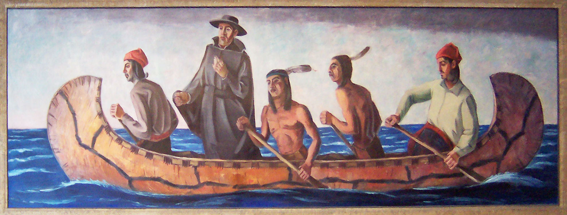 Image: Fr. Marquette Exploring the Shores of Lake Superior, mural by Dewey Albinson, located in the U.S. Post Office of Marquette, Michigan. Public domain.